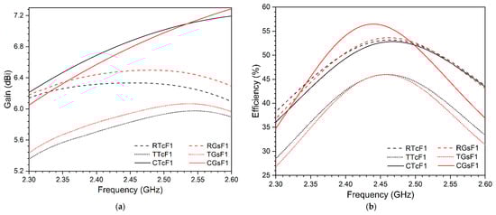 The 2D plots of the simulated gain (dBi) and efficiency (%) are shown in Figure 15 for three graphene sheets (rectangular RGsF1, triangular TGsF1, and circular CGsF1) and three conductive textile (rectangular RTcF1, triangular TTcF1, and circular CTcF1) prototypes. Since all six prototypes of Figure 15 have the same F1 substrate, comparisons between antennas of different geometrical shapes and/or patch materials can be made. The superiority of (i) circular (solid lines) over rectangular (dashed lines) and triangular (dotted lines) prototypes, as well as (ii) graphene patch (red-colored lines) over textile patch (black-colored lines) antennas, is obvious in almost all cases. As depicted in Figure 15a (Figure 15b), the radiation gain (efficiency) of the graphene sheet RGsF1 and TGsF1 (CGsF1) prototypes exceeds the gain (efficiency) of the corresponding conductive textile RTcF1 and TTcF1 (CTcF1) prototypes over the 2.4–2.5 GHz operating frequency band. Figure 15a reveals that the gain of the circular (triangular) prototypes increases considerably (slightly) with increasing frequency, while, at the same time, the gain of the rectangular prototypes is rather stable or tending to decrease. On the other hand, Figure 15b demonstrates that in all cases the efficiency reaches its peak value (between 45.9% for the TGsF1 and 56% for the CGsF1) at the resonant frequency.