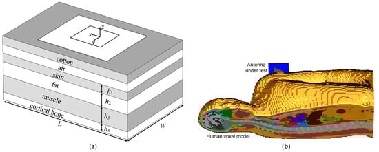 Another issue of concern in wearable devices is the multilevel interaction between antennas and tissues, since the effects of human body proximity on antenna characteristics are well known [,,,,]. Moreover, it is always necessary to comply with the standards, regulations, and limits for the electromagnetic energy absorbed by human tissues [,,].