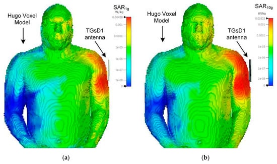 SAR distribution on CST-Hugo’s anatomical voxel model caused by the TGsD1 antenna prototype (@ f = 2.45 GHz) in distance 2.5 mm from the left arm. (a) SAR1 g, (b) SAR10 g.