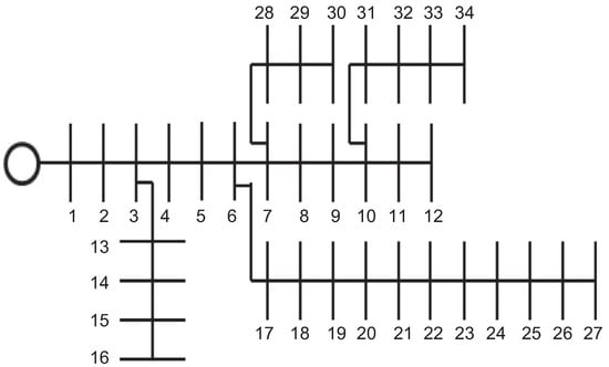 The IEEE 34-bus system is a radial distribution network comprising 34 nodes and 33 lines, which is operated at the substation bus in medium voltage levels with a nominal voltage rate of 11 kV. The electrical configuration of this test feeder is depicted in Figure 1. This test feeder has a total power consumption of kVA, which produces a total active and reactive power loss of kW and kvar, respectively.