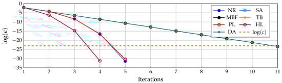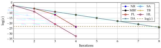 On the other hand, the results in Figure 5 confirm that the convergence rate of the derivative-based methods is quadratic, while that of the derivative-free approaches is linear, with the hyperbolic linearization approach showing the most efficient convergence rate with a slope higher than the Newton–Raphson method and the product linearization approach.