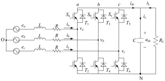 In the discrete mathematical model of PWM rectifier, the model predictive control (MPC) predicts the grid side current, instantaneous power and other electrical quantities in the next control cycle; then the objective function is set according to the needs of the control system, an optimal voltage vector is obtained by solving the optimal objective function [1,2,3,4,5,6]. As a kind of predictive control, it has the advantages of not having a pulse width modulation module, flexible control scheme and high robust performance, and as such has aroused the interest of many scholars [7,8,9,10,11,12].
