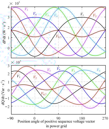 Figure 2 shows the change of instantaneous power rate with the phase Angle of E under the action of eight different voltage vectors (V0–V7). As can be seen from Figure 2, in the case of grid unbalance, the instantaneous power change rate corresponding to the two zero voltage vectors is not constant, but a pulsating component.