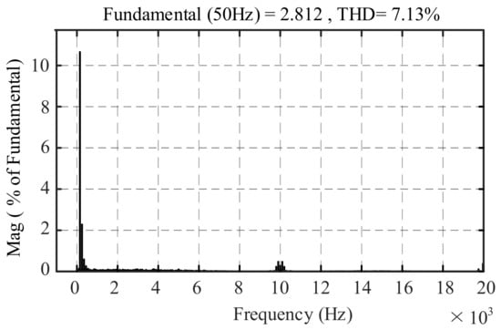 Under unbalanced power grid conditions, the sinusoidal degree of three-phase current waveforms in the traditional FCS-MPDPC is low, as shown in Figure 4 and Figure 5, especially where the A-phase current waveform is seriously distorted, the three-phase current is asymmetric, and the instantaneous power has pulsating components. According to the spectrum analysis of A-phase current, in Figure 6, the THD of A-phase current is 7.13%, which cannot be obtained to meet the requirements of PWM rectifier grid-connected control; the amplitude of fundamental current is 2.812 A. In addition, there are many low-order harmonics, especially the third and fifth harmonics. Therefore, under unbalanced three-phase power grid condition, if the traditional FCS-MPDPC is adopted, the harmonic content of three-phase power grid current is high, which will cause certain “pollution” to the power grid.