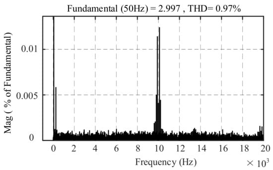 On the contrary, the new FCS-MPDPC has good steady-state performance. In Figure 7 and Figure 8, the current waveform of three-phase power grid is highly sinusoidal, voltage and current are in the same phase, and the new type of instantaneous power pulsation is small. By analyzing the spectrum of A-phase current, shown in Figure 9, the amplitude of fundamental current is 2.997 A; the THD of current is only 0.97%, which significantly reduces the low-order harmonic component of current, and the high-order harmonic is mainly concentrated in the integral multiple of switching frequency. The filter inductor is simple in design.
