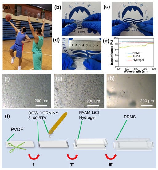 (a) The actual application scenarios of TSB-PENG. (b–d) The bend, twist and stretch state of TSB-PENG (e) The transmittance of PVDF film, PAAM-LiCl hydrogel, PDMS, and TSB-PENG. (f–h) The optical microscopic image of PVDF film, PAAM-LiCl hydrogel, and PDMS. (i) Schematic diagram of manufacturing process of TSB-PENG.