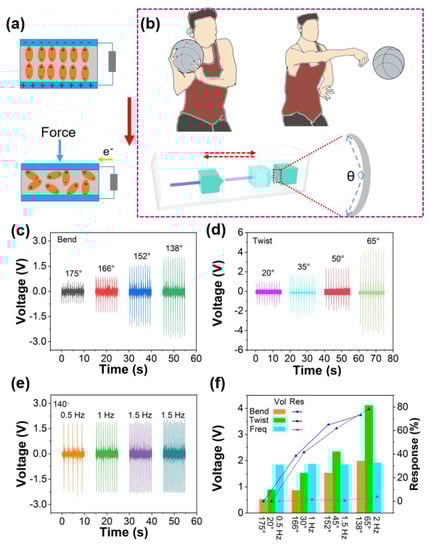 (a) Working mechanism of TSB-PENG; (b) Scene of TSB-PENG monitors the body joint motion system; (c) Outputting piezoelectric voltage of TSB-PENG at the same frequency and different bend angles; (d) Outputting piezoelectric voltage of TSB-PENG at the same frequency and different twist angles; (e) Outputting piezoelectric voltage of TSB-PENG at the same bend angle and different frequencies; (f) Response of output piezoelectric voltage of TSB-PENG at different bend angles, frequencies and twist angles.