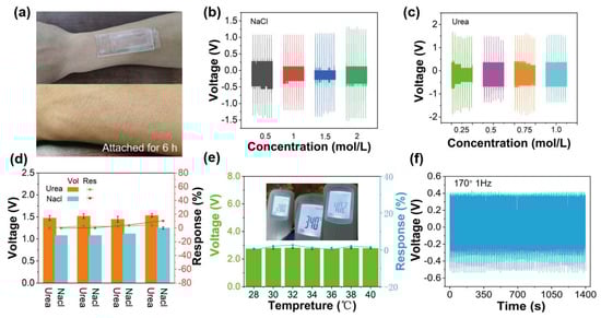In order to prove that TSB-PENG can be applied to the body surface directly, the TSB-PENG is fixed on the body surface for 6 h and no allergic or rejection happens. Human sweat contains a large number of compounds, such as sodium chloride, potassium, and nitrogen metabolites (urea, ammonia, and uric acid) [20]. In this study, different concentrations of NaCl and urea are used to verify the impact on PENG (Figure 3b,c). When the TSB-PENG is at 0.5, 1, 1.5, and 2 mol/L of NaCl, the outputting piezoelectric voltage of TSB-PENG is 1.08, 1.08, 1.12, and 1.23 V, respectively. When the TSB-PENG is at 0.25, 0.5, 0.75, and 1 mol/L of urea, the outputting piezoelectric voltage of TSB-PENG is 1.48, 1.52, 1.45, and 1.54 V, respectively. The response of piezoelectric voltage in different NaCl and urea concentrations is stable. The stable response proves that the TSB-TENG is not affected by sweat. We test the outputting voltage of the sensor when it is at 28–40 °C (Figure 3e). When the temperature is 28, 30, 32, 34, 36, 38, and 40 °C, the outputting piezoelectric voltage is 2.74, 2.79, 2.81, 2.77, 2.74, 2.792, and 2.78 V, respectively. This shows that TSB-PENG has a good temperature adaptability. Figure 3f shows the durability property of TSB-PENG. The TSB-PENG was tested for 20 min and the piezoelectric voltage was stable. This shows that TSB-PENG can work for a long time. As shown in Supplementary Material Figure S1, the TSB-PENG output voltage is still stable at different angles and frequencies. This proves that TSB-PENG has perfect adaptability at different conditions.