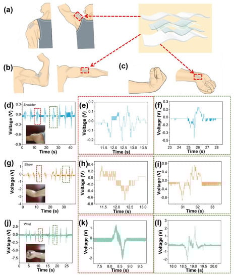 (a–c) Scenes of the working mechanism of TSB-PENG is fixed on the shoulder, elbow, and chest. (d) Outputting piezoelectric voltage of TSB-PENG on the shoulder that does the bend and stretch motion. (e,f) Enlarged drawings of bend and stretch motion of the shoulder. (g) Enlarged drawing of outputting piezoelectric voltage of TSB-PENG is fixed on the elbow which protrudes, bend and stretch. (h,i) Enlarged drawings of the elbow that does protrusion and bend-stretch movements. (j) Outputting piezoelectric voltage of TSB-PENG is fixed on the wrist that protrudes, bends, and stretches. (k,l) Enlarged drawings of the wrist in a protruding and bend stretch motion.