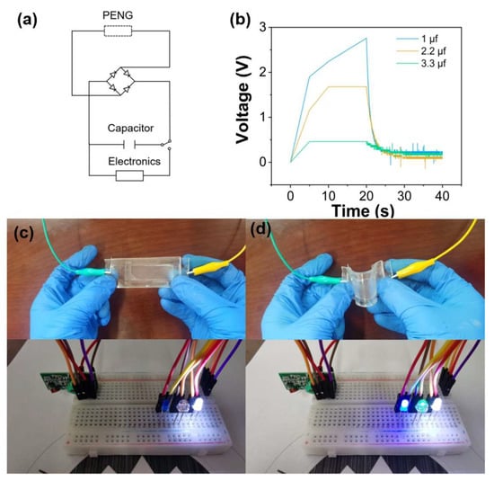 TSB-PENG can not only be used as a sensor to monitor athlete sport status, but it can also collect the mechanical energy of the human body. Figure 5a shows the equivalent circuit of the self-charge system and it can convert the mechanical energy of the human body into electric energy and store it in the capacitor. Figure 5b shows the charging voltage of different capacitor which is charged by TSB-PENG. When the bend angle is 150 ° and the frequency is 3 Hz, the TSB-PENG can charge 1, 2.2, and 3.3 μF to 2.8, 1.7, and 0.3 V. In Movie S2, TSB-PENG charges 4.7 μF for 30 s and drives a portable calculator. Figure 5c,d show the TSB-PENG can drive Bluetooth. The transmitting terminal can launch the piezoelectric signal to receiving terminal. In the Movie S3, the number of flashing lights and flashing frequency is controlled by TSB-PENG. This wireless information transmission function provides broad application scenarios for TSB-PENG.