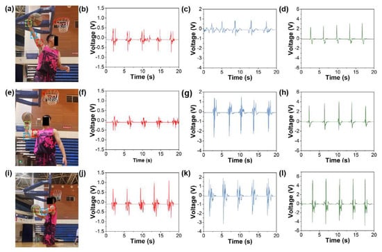 In the basketball game, the quality of passing is one of the decisive factors in the game. Accurate and reasonable passing can tear the opponent’s defense and create the best shooting opportunities [44]. We analyze three kinds of passing techniques with examples, as shown in Figure 6. The outputting piezoelectric voltage of hook pass, shoulder pass, and chest pass are often used in the inner coping area, outer coping area, and middle coping area (The collection process is shown in Movies S4–S6). Figure 6a,e,i show the diagram of hook pass, shoulder pass, and chest pass, respectively. Figure 6b–d show the outputting piezoelectric voltages of the shoulder, elbow, and wrist in a hook pass motion which are 0.39, 0.76, and 2.77 V, respectively. Figure 6f–h show the outputting piezoelectric voltage of shoulder, elbow, and wrist in the shoulder pass motion which are 0.18, 1.22, and 3.564 V, respectively. Figure 6j–l show the output piezoelectric voltages of the shoulder, elbow, and wrist in a chest pass motion, which are voltage is 0.83, 1.61, and 5.41 V, respectively. The voltage of hook pass of the elbow and shoulder is smaller than the voltage of the other two passing of wrist. This is because the hook pass is the player who leads the ball over the head and buckle the wrist to pass the ball, the elbow participates less, and the voltage is lower. The shoulder pass motion requires the athlete to lead the ball over the shoulder, stretch the elbow, and buckle the wrist to pass the ball, whereby the shoulder participates less, and the voltage is lower. Compared with the outputting piezoelectric voltage of three passing types, the voltage of the hook pass is smaller than the other two. This is because the hook pass is usually used in internal coordination area and player passes the ball with the fast motion. The outputting piezoelectric voltage of the chest past in the central response area is higher than the shoulder. This is because the chest pass is fast and accurate in the central response area and the player needs to pass the ball as quickly as possible. However, compared with the shoulder pass, the passing height of the chest pass is lower and the player cannot pass the ball with the high speed between the long distance.