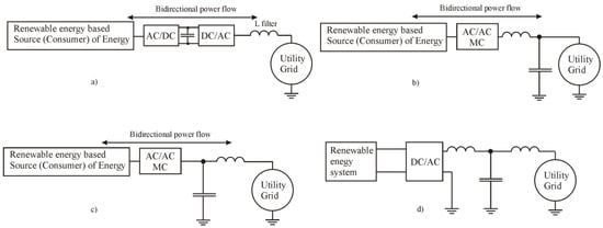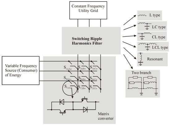 Some renewable energy devices, such as double-fed induction-generator-based wind power plants, can operate as energy consumers and as energy suppliers, depending on their operating mode. In such case, the MC must perform the bidirectional power transmission function and operate in both power consumption and power supply modes. In any of the above-mentioned modes, MC is the source of the switching ripple harmonics. To protect the utility grid from the MC-generated harmonics, the above-mentioned bidirectional power flow and operating modes must be taken into account.