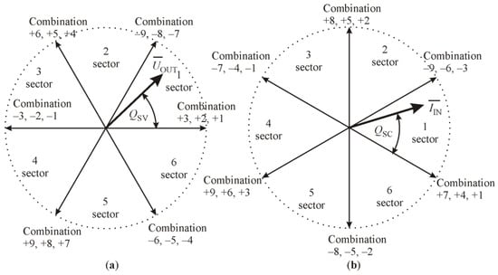 The two adjacent vectors approximate the space vector of the desired output line voltages and input currents. As presented in Equations (1) and (2), the frequency of the MC output voltage is determined by the angle