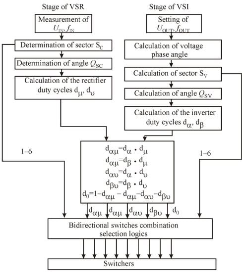 Figure 3. According to the ISVM control strategy, it consists of two sequences representing the rectifier and inverter stages. Every sequence consists of sector determination and duty cycle determination. Both sequences are combined by the common duty cycle determination segment and bidirectional switchers control logic, as presented in