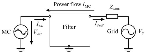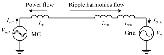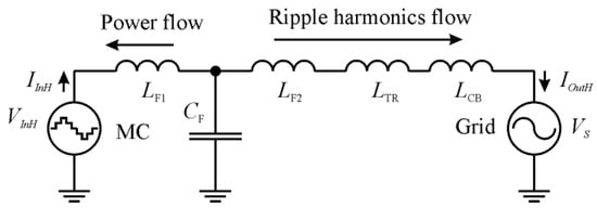 Figure 7, the MC is depicted as a harmonic frequency current source. If the renewable energy device is connected to the utility grid via an MC without the filter, the ripple harmonics generated by the MC will be directly transmitted to the grid. The filter maintaining integration and the coupling connection between the utility grid and the MC have to prevent the penetration of the harmonics current