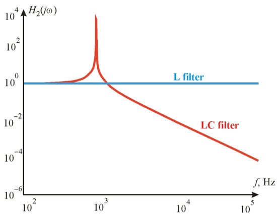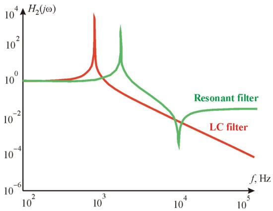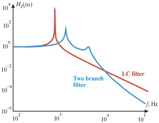 A comparison of the frequency response of the two-branch filter with the frequency response of the previously analyzed LC filter was performed to evaluate its applicability. The same L and C values were maintained. Therefore, an equation sequence analysis was carried out.