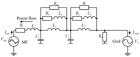 21] introduced one of the rarely applied filter topologies—the two-branch filter. This study evaluated a possibility of applying this topology to the bidirectionally operating MC. The single-phase equivalent circuit diagram of the three-phase grid-connected MC with a two-branch filter is presented in