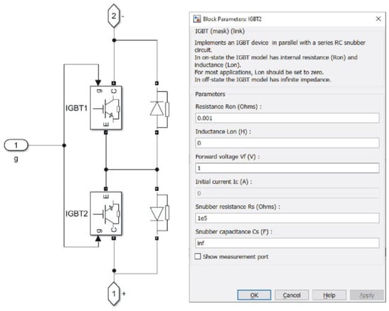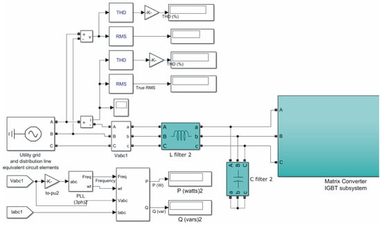The simulation was developed in Matlab/Simulink. The Matlab/Simulink model of the bidirectionally operating MC consists of four parts. The first part contains the utility grid and distribution lines components’ simulation blocks—voltage source plus impedance of utility grid. The Matlab/Simulink block three-phase voltage source in series with RL branch was used to simulate these components. The second part contains blocks for filter element simulation (