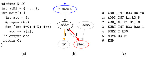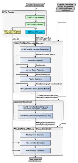 The Compiler for HiPReP (CHiPReP) is a C Compiler, which maps inner loops annotated with a pragma to HiPReP. It is based on the CCF tool [31] (github.com/MPSLab-ASU/ccf, accessed on 21 October 2021), which, in turn, is based on the LLVM compiler framework [36]. CCF is a co-design compiler that generates combined excutables containing host processor code and CGRA code. The host processor code is transformed such that scalar live-in variables processed by the CGRA are stored in global variables by the host processor, and live-out variables are stored by the CGRA in global variables. CCF does not support streamed load-store.