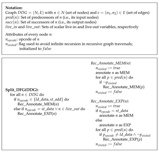 The algorithm annotates DDG nodes as belonging to the EXP or MMP part by recursively traversing the DDG starting from the outputs up to the nodes (for the EXP part) or starting from the and nodes (for the MMP part). Note that some nodes can be annotated as belonging to both the EXP and the MMP par—e.g., this is the case if the loop variable (represented by a phi node) is used both for array address generation and for computing values in the EXP part.