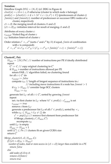 Another approach was suggested in [28]. This method called Function Folding first constructs a DFG of the source program’s loop body. Next, neighboring nodes of the graph, which are supposed to be executed sequentially on a PE, are clustered. Finally, an internal schedule is determined for each cluster, and the clusters are placed, routed and balanced. This idea is flexible and also suitable for multi-cycle operations in floating-point PEs and was, therefore, extended in the CHiPReP compiler.