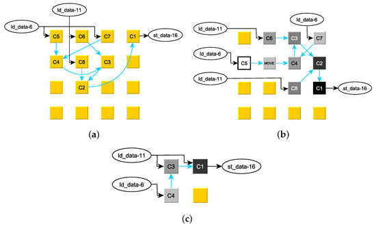 When programming CGRAs in sequential, imperative programming languages, such as C, in most cases inner program loops are mapped to the CGRA. They have to be parallelized or vectorized first [22,23]. Then, DFGs are generated for the loops. In order to use large loop bodies without jumps, conditional statements (if–then–else) are replaced by predicated statements or multiplexers as far as possible (a transformation called if conversion). It is then possible to execute the loop iterations in a pipelined manner. Next, the DFGs are automatically mapped to the CGRA. One example of such a method is the XPP-VC-Compiler [24]. Note that loop-carried dependences are problematic for these approaches since they require a sequential execution of the operations and lead to recurrences in the DFG.