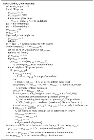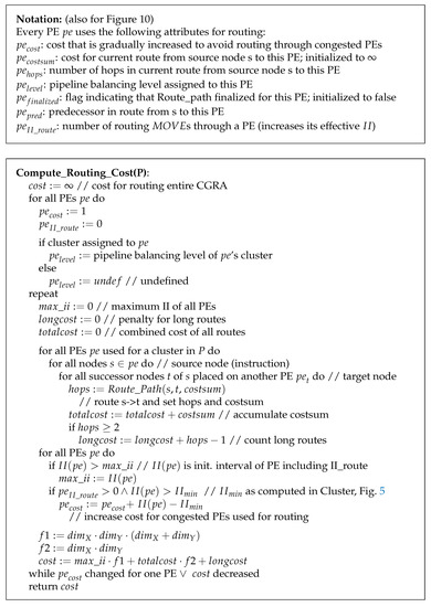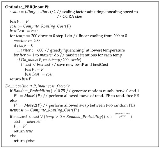 Some algorithms known from Electronic Design Automation for FPGAs are also used for CGRAs: For placing computations on PEs, Simulated Annealing [15,16] is often used. Popular congestion-based routing algorithms are Pathfinder [17] and VPR [18], which contain maze routers [19] based on Dijkstra’s algorithm [20] (Section 25.2). Finally, for pipeline balancing, scheduling algorithms first used in high-level synthesis [21] are employed.