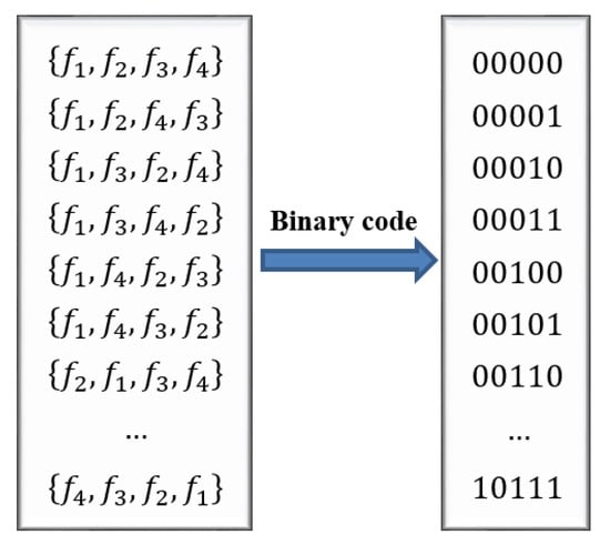 The main idea of group-based key generation is to compare multiple PUF measurement values, rather than comparing them pairwise, in order to generate longer secret keys. The idea has been initially proposed in [17] using the LISA. Suppose that there is a group of four PUF measurement values, . A simple pairing algorithm can generate two pairs from these four elements, which leads to the generation of two secure bits. However, if all four elements are compared together, different orderings are possible. As shown in Figure 1, by assigning a binary code to each ordering according to CSC, five bits can be generated from these four elements. Therefore, group-based key generation is able to improve the entropy of the generated key compared to the pairwise method.
