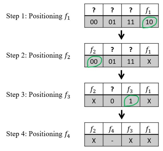 To overcome the abovementioned coding issues, we propose a novel coding scheme and name it positioning syndrome coding (PSC). In this scheme, when the elements of subgroup are measured and ordered by their values, we take the elements one by one and generate a code based on the position of each element in the ordered subgroup. For example, suppose and . The ordered subgroup will be . The position of in from four possibilities is four. One can encode these four possibilities into two bits as 00, 01, 11, and 10. Therefore, 10 is assigned to , as it is shown in step 1 in Figure 2. Note that for encoding the position values, Gray code has been used. For the next element, , there are three possibilities in the ordering, since position four is already determined to be . According to step 2 in Figure 2, the three positioning possibilities for are encoded as 00, 01, and 11. Since it is the largest value in the remaining elements of the group , the code 00 is assigned to . Element is in the second position from the two remaining positions. These two positions are encoded with one bit as 0 and 1 (step 3 in Figure 2). Therefore, 1 is assigned to . Finally, since the position of the last element, , is already determined by positioning the other elements, no code can be generated from this element and it is automatically positioned as seen in step 4 in Figure 2. By concatenating the generated codes, the generated key from subgroup is = 10,001.