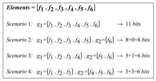Obviously, it is not possible to formulize Equation (6) as a linear function of the decision variables. However, one can find an equivalent linear cost function which, when optimized, guarantees the maximum length of the key. It should be noted that putting as many elements in the first group as possible yields longer keys. For example, the optimum case for six elements is putting all of them in one subgroup to generate 11 bits, while all other grouping possibilities yield shorter keys (Figure 4). Therefore, the cost function can be defined in a way that the ILP solver first tries to make the first subgroup as large as possible, then from the remaining elements finds the second largest subgroup, and so on. It is formulized as a function of decision variables: