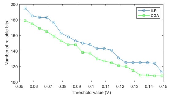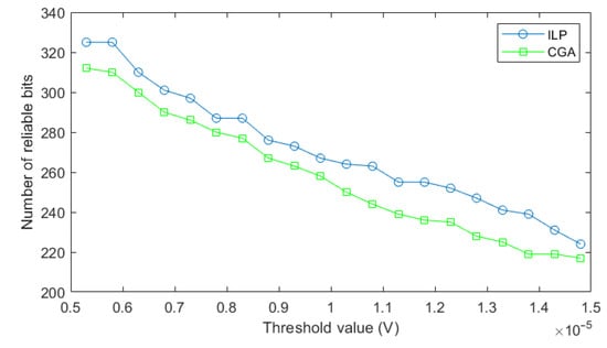 In order to evaluate the proposed ILP, its output has been compared with the CGA outputs for the DiffC-PUF and the SCN-PUF. After the derivation of group data using ILP and CGA, the output key is generated using PSC. Figure 6 and Figure 7 show the number of reliable bits generated from these two methods for DiffC-PUF and SCN-PUF, respectively. The results show a roughly 10 percent improvement in the number of output bits when using ILP. Increasing the threshold value in both PUFs results in stricter constraints when putting measurement values in the groups, which in turn reduces the length of the output key. It is worth noting that, by employing the non-group-based key generation methods mentioned in Section 2.1, the best result comes from the method proposed in [16], which produces 79 bit and 99 bit keys from DiffC-PUF and SCN-PUF, respectively. It is evident that on average, our method improved the key entropy approximately three times compared to the non-group-based key generation methods.