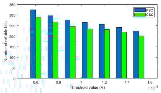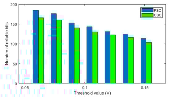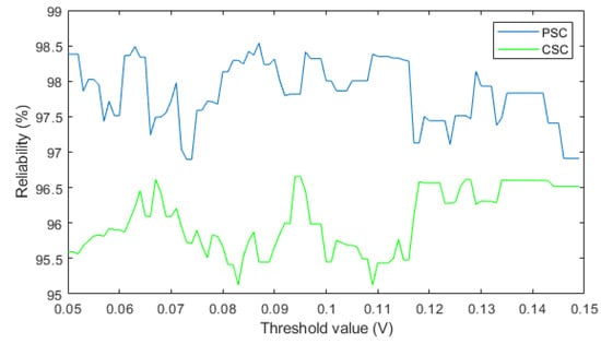 As discussed before, when employing CSC, a single swap in the ordering of the members of a group can cause several error bits. On the other hand, by using PSC, each swap leads to only one bit error. In order to evaluate PSC, the reliability of the keys generated from this method have been compared with those generated by CSC. Figure 10 shows the reliability of the keys when generated using DiffC-PUF measurements by employing PSC and CSC in different threshold voltages. It is evident that the reliability has been improved by roughly 2%, reaching 98% when PSC is used. The datasets used for key generation in this work show significant variations with temperature [3,20]. However, this reliability analysis shows that even for the PUFs which are sensitive to environmental conditions, our proposed method offers close to ideal reliability results.
