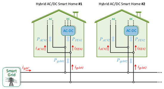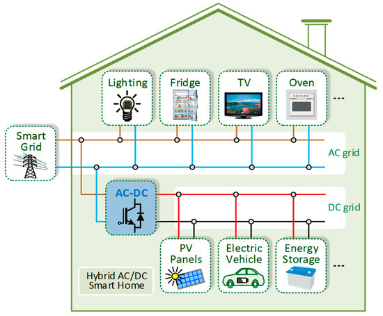 In this context, thanks to solid-state power electronics and since some technologies are natively DC, novel challenges and opportunities are announced. Consequently, a debate of AC versus DC is more than ever-present, comprising smart homes as a fundamental part for boosting the applicability of DC grids in smart grids. The discussion of AC versus DC is not new [16], where, mainly due to the transformers for facilitating changing voltage levels, the AC grids gained preponderance to define the actual power grids. Nevertheless, after some large decades, taking into account the DC nature of some technologies, the DC grids are gained more preponderance [17], where electric mobility, renewables and energy storage have absolutely contributed to the opportunity of shifting for hybrid AC/DC grids. Additionally, to achieve controllability of demand-side, optimization of power production from renewables, and peak shaving paradigms, load shift systems are also fundamental, enabling the management of energy prices throughout the day and, consequently, attenuating peak demand [18]. Control methodologies for DC grids are proposed in [19,20], which ones can be implemented for smart homes, mainly in the perspective of controlling each smart home as a microgrid. Analyses about power converters for DC grids are presented in [21,22], the power quality issues in hybrid AC/DC grids are given in [23], and, moreover, there are widespread reviews about organizations of control and topologies, such as those introduced in [24,25]. Aiming to implement DC grids, AC/DC power electronics converters are required, where typically a two-stage bidirectional structure is necessary based on a front-end converter (i.e., an AC/DC to interface the power grid) and on a back-end (i.e., a DC/DC to interface the DC grid).