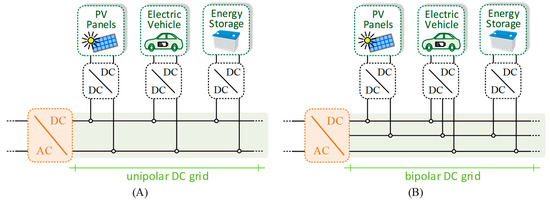 Regarding the structure of DC grids, two main configurations can be implemented: unipolar and bipolar [34,35]. With the objective to highlight the differences between them, an example of each one was introduced in Figure 2. The unipolar is categorized by a two-wire configuration, thus it imposes a single DC voltage level, as shown in Figure 2A. On the other hand, the bipolar is categorized by a three-wire configuration, resulting in two DC voltage levels. Based on a simple comparative analysis, the unipolar has less complexity in terms of design due to the lower number of wires, as well as less complexity in terms of control since it is based on a single voltage level. On the contrary, the bipolar requires an additional wire and the complexity is higher, nevertheless, it presents more flexibility, e.g., it is conceivable to interface technologies with distinct voltage levels. Furthermore, among other advantages, it should be highlighted the possibility to improve efficiency, resilience, and fault-tolerance. An assessment of promising technologies associated with bipolar structures is presented in [40]. Despite such advantages, bipolar structures have an additional problem, which is related to the voltages unbalances due to the linked technologies and bidirectional operation. In the example illustrated in Figure 2B, it is verified that some technologies are linked with two-wires and others with three-wires.