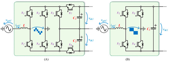 Converters under analysis: (A) Single-phase bidirectional multi-level topology with split DC-link for providing a bipolar DC grid; (B) Single-phase bidirectional topology for providing a unipolar DC grid.