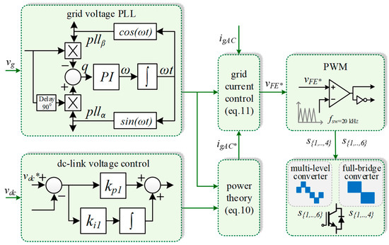 where the voltage vFE is compared with a triangular carrier to define the PWM pattern for the switching devices. Figure 4 shows the simplified block diagram of the control system based on the detailed control equations, where it is possible to visualize the sequence of control: the power theory and the current control do not consider the use of auxiliary signals synchronized with the fundamental positive-sequence component of the grid voltage; there is a control to keep the DC-link voltages regulated, independently of the operation mode; the power theory used to define the current reference according to the different possible operation modes (e.g., selective harmonic compensations and reactive power production); the grid current control according to its reference; the PWM modulation.