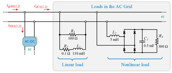 Linear and nonlinear loads considered in the experimental validation, connected to the AC grid, and permitting an operation with reactive power and currents with harmonic content.