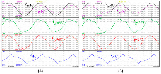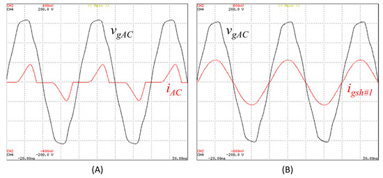 Experimental results showing the voltage (vgAC) (100 V/div) and the current (igAC) (20 A/div) on the main AC grid, the current consumed by each front-end AC/DC converter of each smart home (igsh#1 and igsh#2) (5 A/div), and the current of the AC grid of smart home #1 (iACsh#1) (5 A/div): (A) Situation when the front-end converter of smart home #1 is used to compensate the current harmonics of order 3, and the front-end AC/DC converter of smart home #2 is used to compensate the current harmonics of order 5; (B) Situation when the front-end AC/DC converter of smart home #1 is used to compensate the current harmonics of order 3 and 5, and the front-end AC/DC converter of smart home #2 is used to compensate the reactive power.