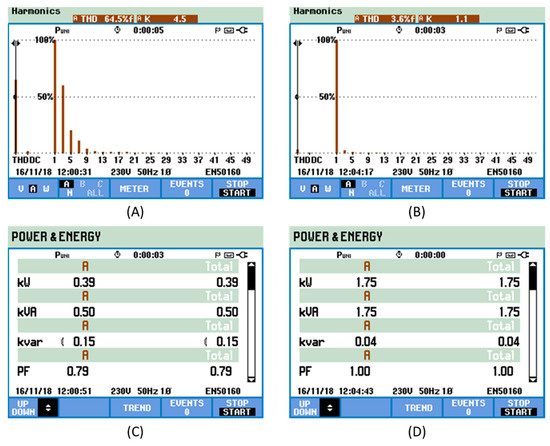 Experimental values for smart home #1. THD value and harmonic spectrum of the: (A) Current of the AC grid (iAC#1); (B) Total current of the hybrid AC/DC grid (igsh#1). Consumed powers and power factors for the: (C) AC grid; (D) Hybrid AC/DC grid.
