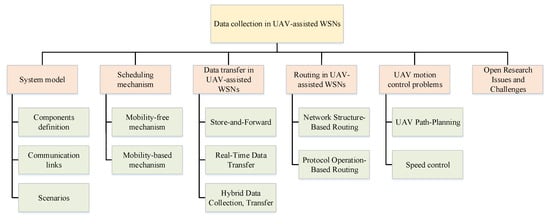 The rest of the paper is organized as follows. Section 2 describes the system models that would be used in the most existing data collection scenarios. Section 3 presents in detail scheduling mechanisms. Section 4 provides data transfer in UAV-assisted WSNs. Section 5 addresses routing problems in UAV-assisted WSNs. Section 6 provides UAV motion control problems. Section 7 propounds open research issues and challenges. Finally, conclusions and future developments are addressed in Section 8.
