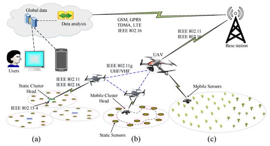 Communication links can use different protocols and various communication techniques, as shown in Figure 2. In general, there are three types of links in UAV-assisted WSNs including sensors to cluster heads, UAVs to ground stations, and UAVs to UAVs, as shown in Table 1. This presents different technologies and shows they are utilized at each level of architecture.