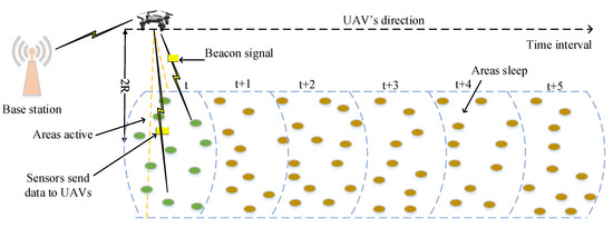 Transferring data in real-time from sensor nodes to remote base stations is required in some specific applications. Figure 7 depicts the model working mechanism. As sensors detect a special event that requires real-time monitoring, a message indicating the location of the event is released. UAVs are sent to this location to perform real-time data collection. When UAVs are within the communication ranges of sensors, they play a role as gateways that provide real-time data transfer between sensor nodes and base stations.