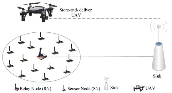 Relay nodes (RNs): RNs are important components in large-scale WSNs. RNs are responsible for collecting data from the SNs. RNs can perform various functions such as data compression and data routing, while collecting data. Each RN has a memory buffer that stores the received data from the SNs. Finally, the data would be transmitted to UAVs when the UAVs reach the positions within their transmission ranges. The data transmission between RNs to UAVs can be completed based on a pre-scheduled cycle. Therefore, the RNs may not need to be placed within the others’ communication ranges.