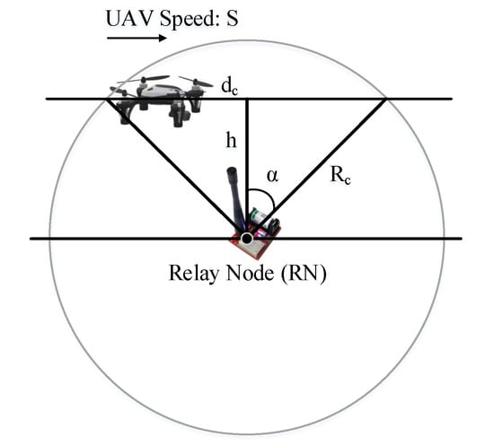 Relay Nodes-to-UAV and UAV-to-Sink links [40,41,42,43]: Communication standards that have medium transmission distances such as IEEE802.11 (WiFi) are suitable for connections between RNs and UAVs or UAVs and Sinks. The communication standard has communication distances from 100 m to several hundred meters, and transfer rates from 1 Mbps to 54 Mbps. Standard IEEE 802.16 has a speed of up to 70 Mbps. Hence, it is suitable for UAVs operating at high altitudes of several kilometers. The model of the transmission channel between the UAV with height h and coverage radius R and the ground stations is mentioned in the paper [44]. The path loss will be calculated according to the formula: