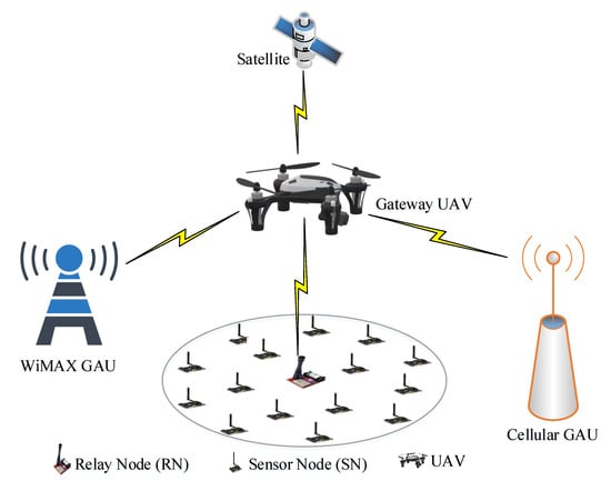 Data collection methods have been well exploited in the literature review. Routing mechanisms including random walk [8], tree-based routing [9], cluster-based [10], shortest paths [11], etc., have been considered to find the best solutions for saving energy in data routing in such networks. These methods attempt to reduce the number of hops in routing, and also to reduce communication distances, etc., that lead to reducing energy consumption in WSNs. In addition, some advanced data processing algorithms are also integrated into the routing methods that aim to reduce the sensing data collected from the networks to be sent to the base station (BS) [12,13]. Compressed sensing techniques [14] are applied in WSNs that can combine with conventional mechanisms, significantly reduce the amount of sensing data to be sent to the BS [15,16]. Other methods exploited the high correlation of sensing data to compress and to send only a certain number of measurements to the BS [17,18]. All of these methods aim to reduce the total energy consumption in such networks. However, the sensor nodes are often small, inexpensive, and low in computational capacity. Hence, they still are not capable of making long-distance communications to the BS in various cases.
