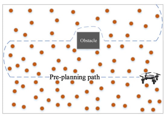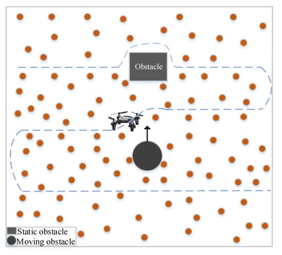 Online trajectory planning is introduced to resolve system and mission uncertainties while mobile sinks operate, which is illustrated in Figure 9. In [99] is investigated dynamic path planning for UAVs based on demands of sensor nodes. By receiving feedback from sensor nodes, UAVs can redesign the trajectory to adapt to the requirements of sensors. The parameters of a flight controller can also be adjusted to optimize the flight performance. In paper [28], sensor nodes can be assigned to become cluster heads depending on their residual energy. UAVs have to update the trajectories as the cluster head roles change. In paper [100], the authors propose cooperation between WSNs and UAVs to monitor wildfires. Static sensors are distributively deployed in a target area. Whenever sensor nodes detect possible signals of a wildfire, sensors broadcast their warning signals. Then, UAVs move to warn locations to perform further data collection processes. Online path planning is also used to provide safe flights for UAVs while operating in complex environments which are hard to model, such as environments with moving obstacles. In paper [101], a collision-free trajectory-planning algorithm is introduced for UAVs to navigate in dynamic environments. First, an initial trajectory is determined for each UAV. If UAVs detect possible collisions with static obstacles or other UAVs while performing a mission, UAVs update their trajectory to avoid collisions. The online trajectory planning is implemented based on Rapidly Exploring Random Trees and Optimal Rapidly Exploring Random Tree algorithms.