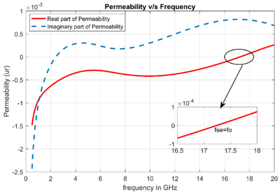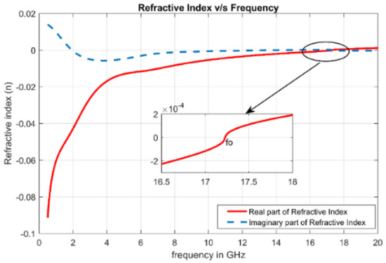 The simulated results for central gap width (w1) of 0.5 mm, and outer (L1) and inner (L2) width of 3 and 1.5 mm, respectively, are illustrated in Figure 2, Figure 3 and Figure 4. The permittivity, permeability and refractive index for the CMC is zero at 17.23 GHz. As a result, the material is capable of sustaining forward waves greater than 17.23 GHz and backward waves less than 17.23 GHz. Additionally, the material transitions seamlessly from the Double Negative to the Double Positive spectrum. In general, a DNG metamaterial with negative index properties up to 17.23 GHz was designed and can be used for negative index applications.