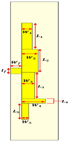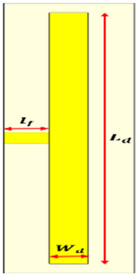 The antenna was designed for wideband operations, to support the wide range of frequencies between 1.8 GHz to 3.8 GHz. The antenna was designed as a patch antenna with a dipole like a patch element on FR4 (lossy) substrate, as shown in Figure 5. The dielectric constant of the substrate was chosen to be 4.3 with a loss tangent and thickness of 0.02 and 1.574 mm, respectively. The initial dimensions were estimated with the use of the dipole antenna theory. The input impedance of the half wave dipole [28] with infinitesimally thin width can be defined in terms of the length of the dipole antenna and phase constant as: