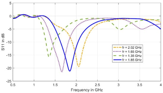 The constant k is estimated as 1.15 according to the procedure outlined in [29]. Thus, it is clear from the mathematical expression that the larger the length, the smaller the resonating frequency, and vice versa. The same behavior was examined in the full wave electromagnetic simulations and is represented in Figure 6. The resonating frequency observed is inversely proportional to the length of the dipole.