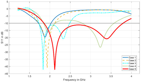 A multiple width dipole antenna is shown in Figure 7, which is capable of achieving the different resonance frequencies in accordance with the length and width combinations of multiple elements. The width and length of the dipole elements are considered as controlling elements to control the overall bandwidth and resonance of the antenna. The wideband achieved can be understood by arranging the desired resonating frequencies in ascending order. They can be assumed to be further divided into four close bands. The first of these can be designated as low frequency LTE bands and consists of band nos. 35, 39, 33, 37 and 36. The two middle frequencies LTE bands can be identified as band nos. 34 and 40, 41, 38 respectively. The last high frequency bands consist of LTE band nos. 42, 43 and NR n78. The NB-IoT bands almost coincide with the LTE bands, so they are not assumed separately for wideband accomplishment. These close bands can be obtained by dipole elements 1 and 3 for low frequency LTE bands and elements 5 and 2 for middle frequency LTE bands. Similarly, high frequency bands can be achieved through dipole element 4. The simulations were performed using CST microwave studio with the length and width of the feeding strip of 5.6 and 4.7 mm, respectively. The ground layer is considered to be infinite with some extra spacing for the substrate in addition to the maximum width and length of the dipole to compensate for the fringing fields. A few of the selected cases for different controlling elements are represented in Figure 8 and Table 1.